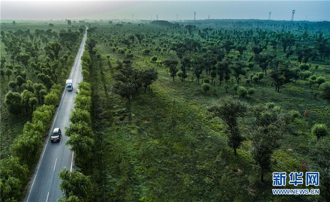 汽車行駛在陜西省榆林市靖邊縣東坑鎮(zhèn)新建村的道路上(2018年8月1日無人機(jī)拍攝)。陜西省開展的天然林保護(hù)工程和全面治理荒沙行動(dòng),極大改善了毛烏素的生態(tài)環(huán)境,也使沙漠南緣的陜西省榆林市實(shí)現(xiàn)從“沙進(jìn)人退”到“綠進(jìn)沙退”的轉(zhuǎn)變。 新華社記者 陶明 攝