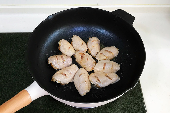 6.腌制好的雞翅,用廚房紙吸干表面的水份,煎制時(shí)才能上色。開(kāi)中火,不粘鍋里倒入少許食用油,油熱后放入雞翅。