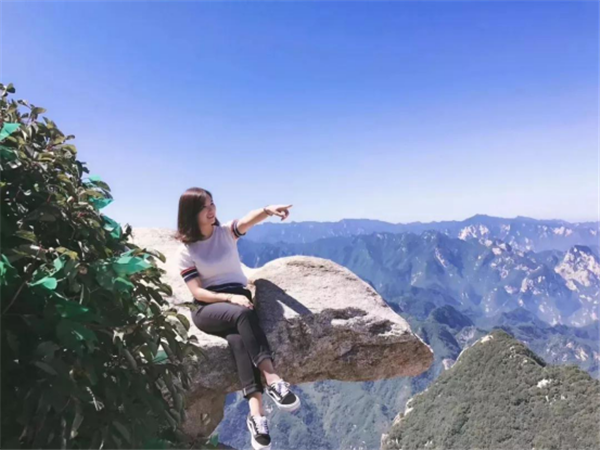 奇特之處:此奇石位于蓮花峰巔。一巨石一分為三,截面如刀削斧劈,石縫能容人出入,石下有凹凸,形似婦人仰臥的印痕,形象生動。