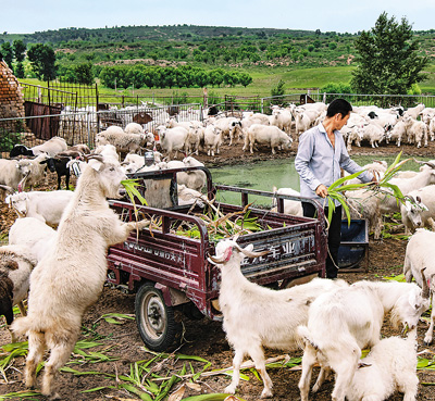 三北防護林工程極大改善了毛烏素沙漠地區(qū)的生態(tài)環(huán)境。圖為當地村民在圈舍中喂羊。新華社記者 陶 明攝