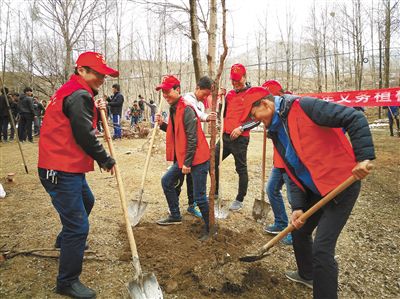 經(jīng)過(guò)一個(gè)下午的努力,100多棵小樹(shù)苗挺立在公路兩側(cè),迎著春風(fēng),煥發(fā)出勃勃生機(jī)。