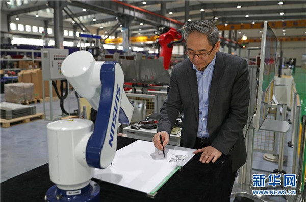 3月29日,沈陽新松機(jī)器人自動化股份有限公司創(chuàng)始人兼總裁曲道奎和公司生產(chǎn)的機(jī)器人共同書寫“愛國奮斗”字樣。 新華社記者 楊青 攝