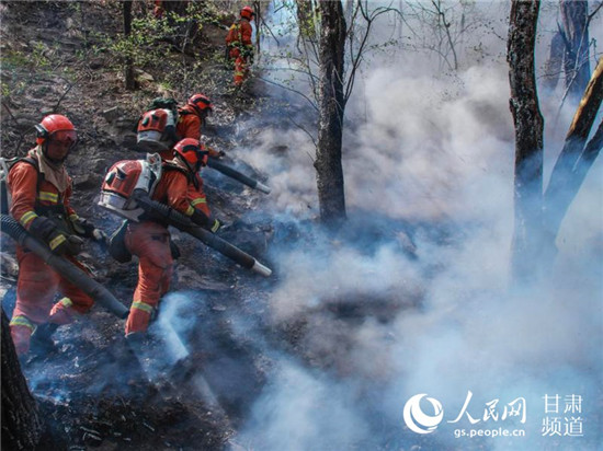 消防員到達(dá)火場后開始打火。(甘肅省森林消防總隊(duì)供圖)