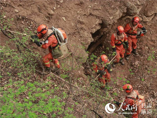 消防指戰(zhàn)員現(xiàn)場開辟臨時(shí)通道,采用繩索攀登的方式組織上山。(甘肅省森林消防總隊(duì)供圖)