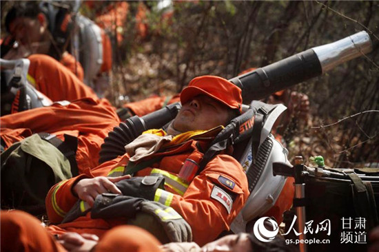 火場火勢緩解后,消防員原地休息。(甘肅省森林消防總隊(duì)供圖)