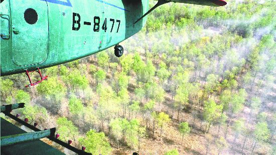 4月14日,一架農(nóng)用飛機(jī)在第一師10團(tuán)防風(fēng)林帶上空噴灑殺蟲劑。自4月上旬以來,兵團(tuán)對葉爾羌河、塔里木河流域的第一師、第二師和第三師的35萬畝野生胡楊林和人工林實(shí)施飛防,有效控制食葉害蟲對野生胡楊林和人工林的危害。王志清 攝