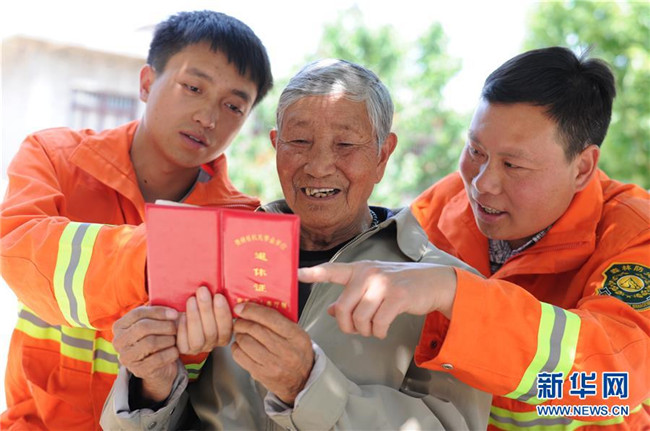 4月27日,在貴州省畢節(jié)市赫章縣平山國有林場,李代關老人(中)向兒子李瓊江(右)、孫子李健展示他的退休證。 新華社記者 楊楹 攝
