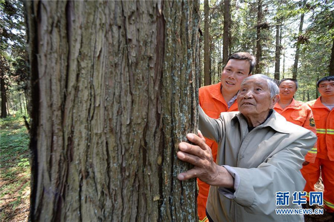 4月27日,在貴州省畢節(jié)市赫章縣平山國有林場,李代關老人(前)在查看當年和同事種的杉樹。 新華社記者 楊楹 攝