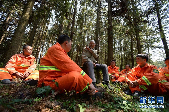 4月27日,在貴州省畢節(jié)市赫章縣平山國有林場,李代關老人(左三)與林場職工交流。 新華社記者 楊楹 攝