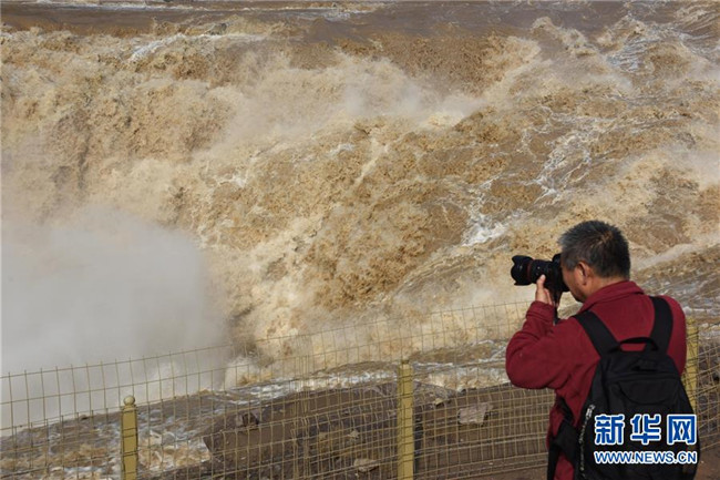 4月29日,游客在山西省臨汾市吉縣黃河壺口瀑布景區(qū)拍照。 近日,受上游降雨和水庫調(diào)節(jié)放水影響,晉陜交界的黃河壺口瀑布再現(xiàn)壯美瀑布群景觀。 新華社發(fā)(呂桂明攝)