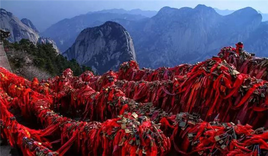 蓮花峰因為一個傳說故事而得名,即《寶蓮燈》沉香劈山救母。便是指這華山西峰了。石徑兩邊的保護鏈上掛滿了祈福的金鎖。這也成為了華山一景。