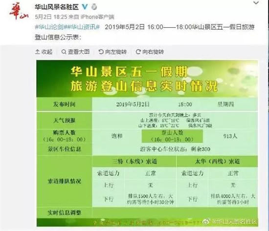 在五一小長(zhǎng)假期間游客朋友們還可以通過關(guān)注@華山風(fēng)景名勝區(qū)新浪微博或者通過景區(qū)LED電子大屏準(zhǔn)確知曉各個(gè)時(shí)間段的登山人數(shù),以便合理調(diào)整自己的游覽計(jì)劃。