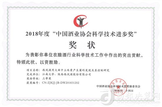 近日,中國酒業(yè)協(xié)會第五屆理事會擴大會議在北京隆重舉行,大會突出表彰了在釀酒產(chǎn)業(yè)科技發(fā)明、技術推廣、科技成果轉化等方面取得了杰出業(yè)績和重要貢獻的領軍人才和優(yōu)秀專家,表彰了2018年度“中國酒業(yè)協(xié)會科學技術獎”獲獎項目和論文的完成單位及個人,并頒發(fā)證書及獎金。西鳳集團公司《西鳳酒用大曲中土味素產(chǎn)生菌的發(fā)現(xiàn)及其控制研究》項目榮獲中國酒業(yè)協(xié)會科學技術進步獎三等獎。受到了大會表彰。