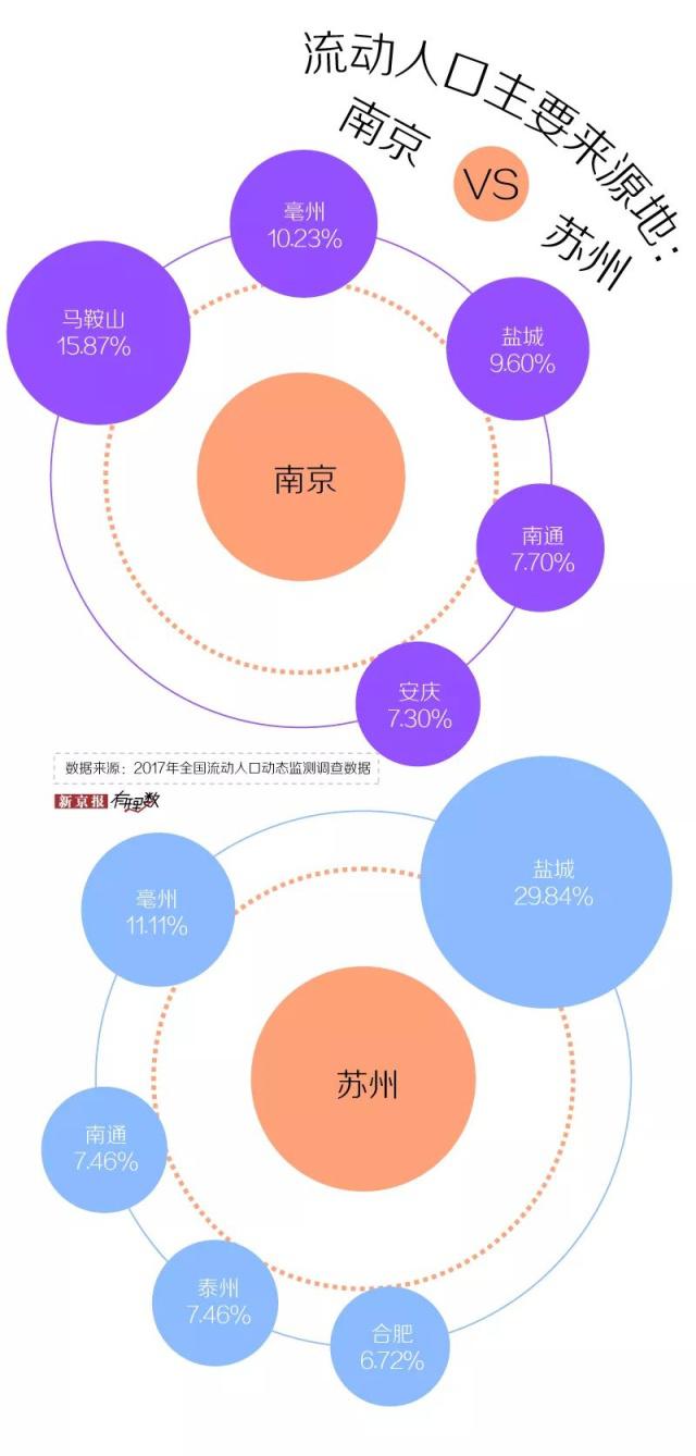 根據(jù) 2017 年全國流動人口動態(tài)監(jiān)測調(diào)查數(shù)據(jù),南京流動人口的第一來源地是馬鞍山,前五大來源地中有三個是安徽的城市;蘇州流動人口的第一來源地是鹽城,前五大來源地本省占了三個。