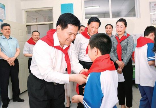 李紀(jì)恒來到一年級(jí)二班,“愛祖國、擔(dān)大任,爭做新時(shí)代好隊(duì)員”主題隊(duì)日活動(dòng)正在舉行,一名少先隊(duì)員走上前來,為他戴上鮮艷的紅領(lǐng)巾。李紀(jì)恒說,看到小朋友們快樂活潑、朝氣蓬勃,我很高興,“六一”國際兒童節(jié)快到了,我提前祝大家和全區(qū)的小朋友們節(jié)日快樂、學(xué)習(xí)進(jìn)步、健康成長。
