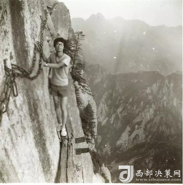 我照相的時(shí)候,一只手抓鐵鏈,一只手做動作,身體是緊貼石壁。難得的是當(dāng)年一起去的一個(gè)女生給我照相,在我對面一樣危險(xiǎn),但女俠單手抓鐵鏈,整個(gè)身體外突懸在半空中,另一只手拿相機(jī)找一個(gè)最好角度給我拍照,我都替她擔(dān)心。——摘自網(wǎng)友2003年爬華山的游記