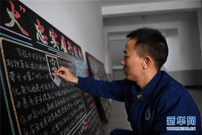 在奇乾中隊的營地,來自四川大涼山的彝族小伙兒布約小兵用粉筆修飾黑板報(5月18日攝)。新華社記者 劉磊 攝