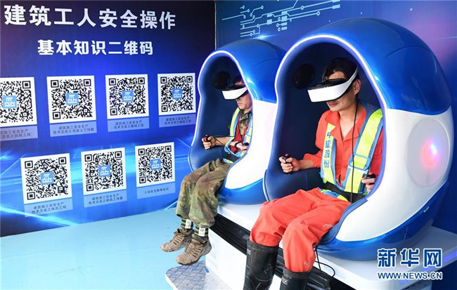 6月5日,重慶化龍橋超高層項目工人在VR安全體驗館內(nèi)通過特種標(biāo)識識別系統(tǒng)學(xué)習(xí)安全標(biāo)識。新華社記者 王全超 攝