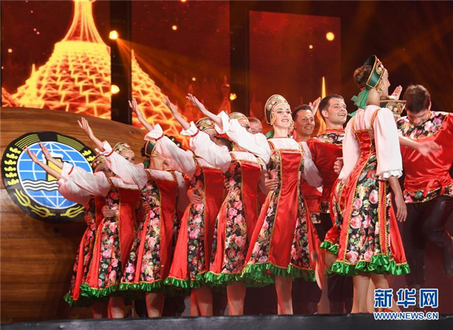來(lái)自俄羅斯的演員在青島國(guó)際啤酒節(jié)開幕式上表演(2018年7月20日攝)。新華社記者 李紫恒 攝