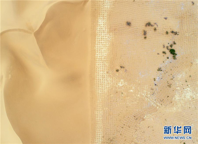 寧夏中衛(wèi)市長(zhǎng)流水沙區(qū),一邊是沙漠,一邊是用草方格治理后的區(qū)域(6月12日無(wú)人機(jī)拍攝)。