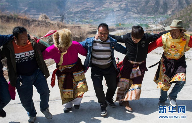 在云南香格里拉市五境鄉(xiāng),“精準扶貧感恩連”隊員在跳鍋莊(3月13日攝)。新華社記者 胡超 攝