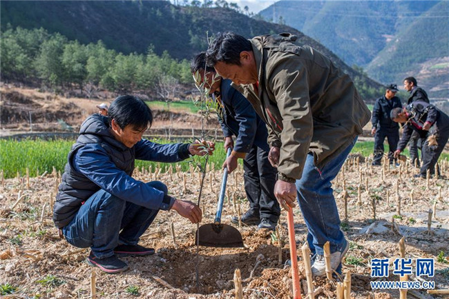 在云南香格里拉市五境鄉(xiāng),格茸(左)和“精準扶貧感恩連”隊員在植樹(3月13日攝)。 新華社記者 胡超 攝