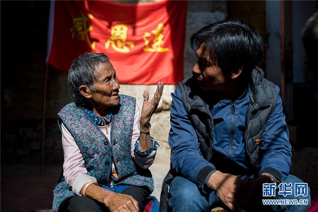 在云南香格里拉市五境鄉(xiāng),格茸(右)和達瓦卓瑪老人聊天(3月13日攝)。新華社記者 胡超 攝