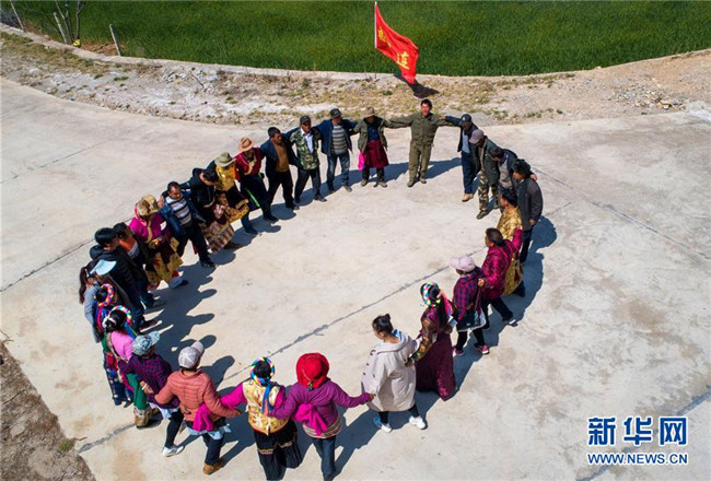 在云南香格里拉市五境鄉(xiāng),“精準扶貧感恩連”隊員在跳鍋莊(3月13日無人機拍攝)。新華社記者 胡超 攝