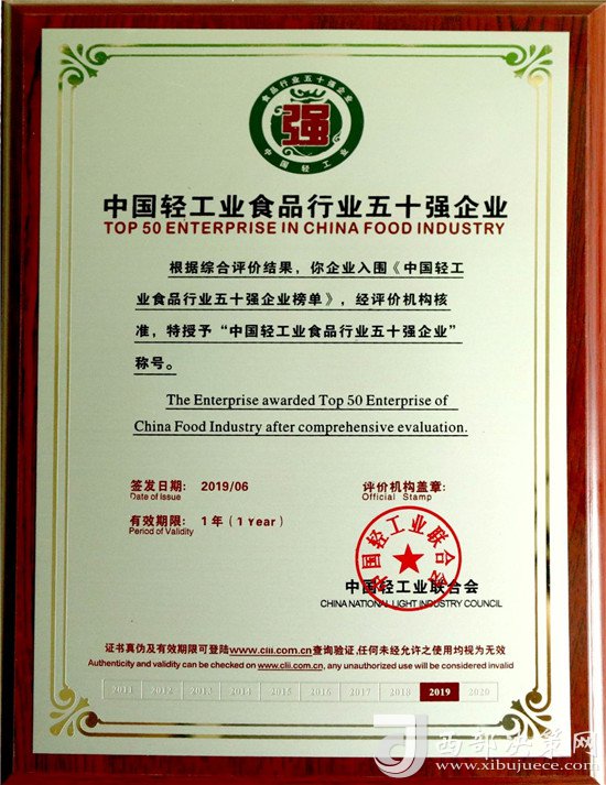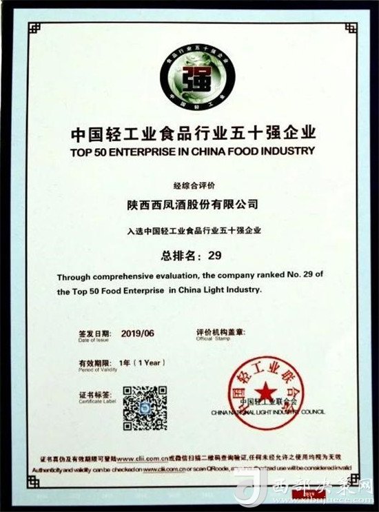 近日,由中國輕工業(yè)聯(lián)合會主辦,主題為“強(qiáng)化科技創(chuàng)新,服務(wù)美好生活”的“中國輕工業(yè)百強(qiáng)企業(yè)高峰論壇”在北京召開。會上,中國輕工業(yè)聯(lián)合會公布了2018年度中國輕工業(yè)食品行業(yè)五十強(qiáng)企業(yè),西鳳股份公司憑借良好的發(fā)展業(yè)績、市場口碑、行業(yè)競爭力及日益增強(qiáng)的品牌影響力,被中國輕工業(yè)聯(lián)合會授予“中國輕工業(yè)食品行業(yè)五十強(qiáng)企業(yè)”榮譽(yù)稱號,并受到表彰獎(jiǎng)勵(lì)。