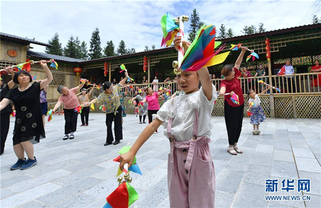 7月1日,游客在湖北省恩施土家族苗族自治州宣恩縣珠山鎮(zhèn)車洞坪民宿旅游區(qū)體驗土家族“八寶銅鈴舞”。新華社發(fā)(宋文 攝)