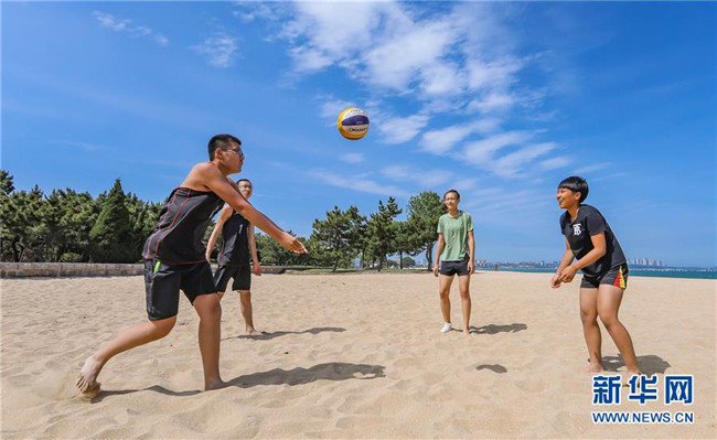 6月30日,人們在山東省榮成市桑溝灣海域的沙灘上玩沙灘排球。新華社發(fā)(李信君 攝)