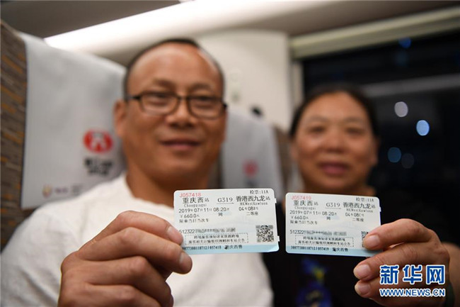 7月11日,乘坐G319次列車的乘客展示前往香港的車票。當(dāng)日,重慶至香港直達高鐵正式開通,此次首發(fā)的G319次復(fù)興號列車運行速度350km/h,沿途經(jīng)停遵義、貴陽東、桂林西、肇慶東、廣州南和深圳北站。列車由重慶西站至香港西九龍站全程運行需7小時37分鐘,全程票二等座票價為660元。目前內(nèi)地與香港聯(lián)通的高鐵車站已增加到58個。新華社記者唐奕攝