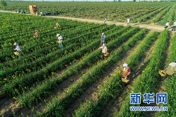 7月4日,紅寺堡區(qū)太陽山鎮(zhèn),村民正為采摘黃花菜奔忙。 新華網(wǎng)發(fā)(祁瀛濤 攝)