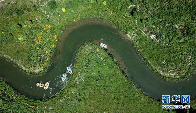 7月21日,游客在承德縣柳河十八灣花海漂游景區(qū)體驗(yàn)漂流(無(wú)人機(jī)拍攝)。