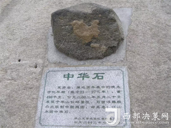 “中華石”于2002年5月20日在華山仙峪景區(qū)被發(fā)現(xiàn)。在淡墨色花崗巖石面上,浮雕般凸現(xiàn)出一塊白色石圖,此圖酷似現(xiàn)制中國(guó)版圖,十分形象通真。該石重約498千克,云母花崗巖石,大約形成于三千萬年前的白堊時(shí)期,現(xiàn)置北峰。(供稿:華旅集團(tuán)營(yíng)銷中心)
