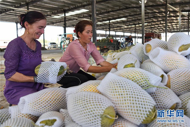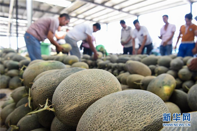 在新疆果品(伽師)批發(fā)交易市場,瓜農(nóng)在分揀伽師瓜,準(zhǔn)備外運(yùn)銷售(8月10日攝)。新華社記者 丁磊 攝