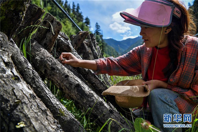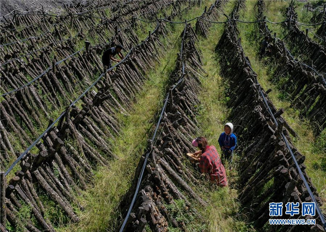 8月10日,四川壤塘縣下大石溝村村民在青杠木耳地中勞作。新華社記者 張超群 攝