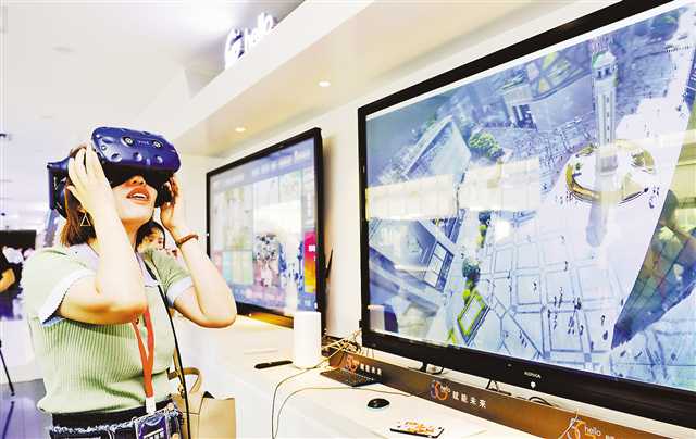 8月15日,在中國電信重慶公司,體驗者頭戴VR設備,觀看解放碑的實時全景。在未來,5GVR將會在智慧旅游、遠程教育、遠程會議等多領域應用。(本組圖片均由記者張錦輝攝)