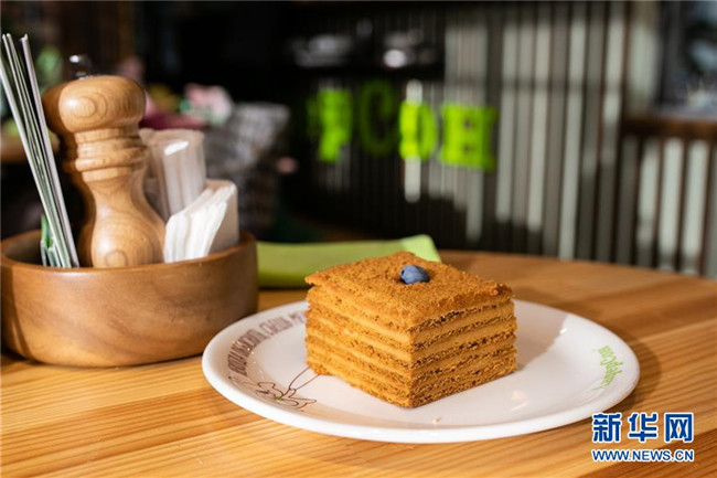 這是8月28日在俄羅斯首都莫斯科的一家咖啡廳內(nèi)拍攝的俄式蜂蜜蛋糕。新華社記者 白雪騏 攝