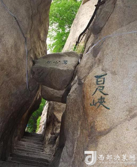 出千尺㠉不遠是百尺峽,這里是登山第二道險關(guān)。兩壁高聳,中間夾有一塊從天而降的巨石,上刻“驚心石”三個大字,游人要從石下小路穿過,確實驚心動魄。此后還有仙人橋、俯渭崖、黑虎嶺等小險處,就到了登山第三道險關(guān)老君犁溝,這是夾在陡峭石壁之間的一條溝狀險道,深不可測,有石階570有余。