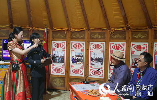牧民布和(上圖右二)在當(dāng)?shù)馗虏榉▌?wù)室通過(guò)4K機(jī)頂盒智能服務(wù)終端,向律師咨詢法律問(wèn)題。