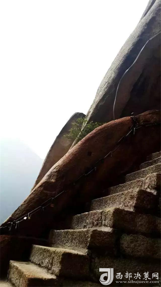 過千尺幢經(jīng)百尺峽就到了“老君犁溝”,其盡頭是“猢猻愁”,顧名思義,連猴子都發(fā)愁,足以說明崖壁有多么陡峭。過了“猢猻愁”就到了華山北峰。是夾在陡峭石壁之間一條深不可測的溝狀險(xiǎn)道,石階570多階。傳說太上老君過此處,見無路可通,就牽來青牛一夜間犁成這條山溝。至今在西側(cè)的崖上仍有石溝赫然若犁槽。