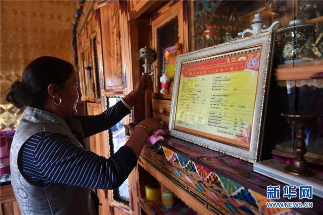 在青海省玉樹(shù)藏族自治州治多縣治渠鄉(xiāng)同卡村,村民昂文西讓的妻子布沙措江卓瑪清理家里的柜子(9月12日攝)。新華社記者孫瑞博攝