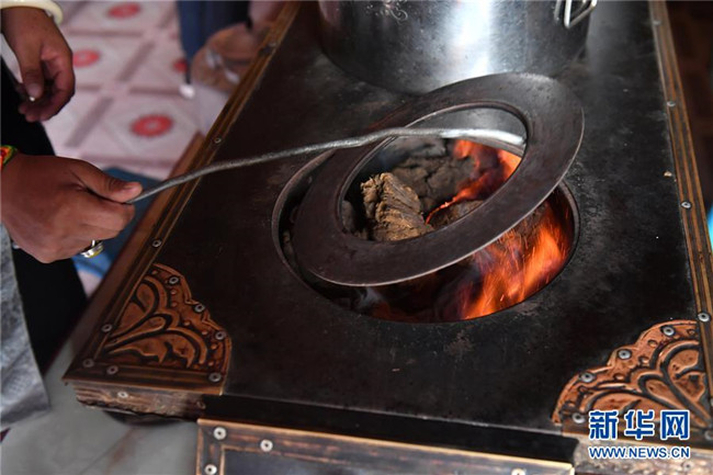 在青海省玉樹(shù)藏族自治州治多縣治渠鄉(xiāng)同卡村,村民布沙措江卓瑪給家中的爐子添加燃料——牛糞(9月12日攝)。在當(dāng)?shù)兀鍧嵀h(huán)保的牛糞依然是不少牧民選用的主要燃料。新華社記者孫瑞博攝