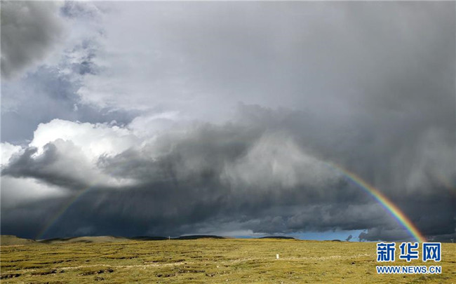 在青海省玉樹(shù)藏族自治州治多縣用手機(jī)拍攝的雨后彩虹(9月11日攝)。新華社記者鄒樂(lè)攝