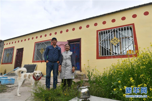 在青海省玉樹(shù)藏族自治州治多縣治渠鄉(xiāng)同卡村,村民昂文西讓和妻子布沙措江卓瑪站在易地搬遷的新家院子里合影(9月12日攝)。新華社記者孫瑞博攝