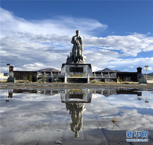 這是在青海省玉樹(shù)藏族自治州治多縣用手機(jī)拍攝的“環(huán)保衛(wèi)士”杰桑·索南達(dá)杰的雕像(9月12日攝)。新華社記者鄒樂(lè)攝
