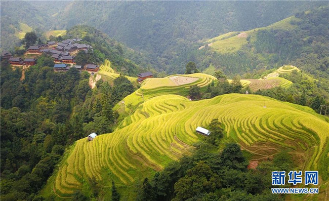 近日,貴州省黔東南苗族侗族自治州榕江縣計劃鄉(xiāng)計劃村陽開苗寨的水稻陸續(xù)成熟,農民們搶抓農時收割稻谷。從空中俯瞰,層層疊疊的梯田線條分明,與古樸的苗寨木樓相互映襯,美不勝收。 新華社記者 楊文斌 攝