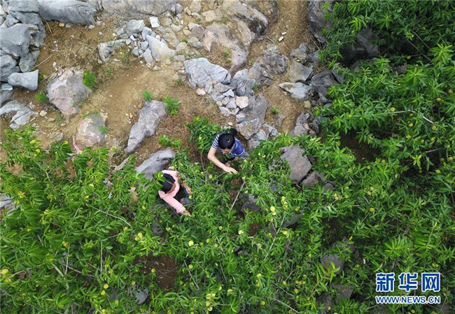 農(nóng)民在貴州省印江縣朗溪鎮(zhèn)昔蒲村的石漠化治理區(qū)采摘桃子(6月26日無人機拍攝)。 近年來,貴州省圍繞產(chǎn)業(yè)選擇、培訓(xùn)農(nóng)民、技術(shù)服務(wù)、資金籌措、組織方式、產(chǎn)銷對接、利益聯(lián)結(jié)、基層黨建等“八要素”,通過“減、融、服”創(chuàng)新推進農(nóng)村產(chǎn)業(yè)結(jié)構(gòu)調(diào)整,既帶動了農(nóng)戶增收,也推動了特色產(chǎn)業(yè)做大做強。 新華社記者 楊文斌 攝