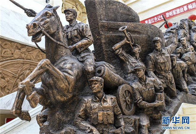 這是在新疆生產(chǎn)建設(shè)兵團第六師五家渠市博物館內(nèi)展出的大型雕塑《軍墾魂》(7月31日攝)。新華社記者 王菲 攝